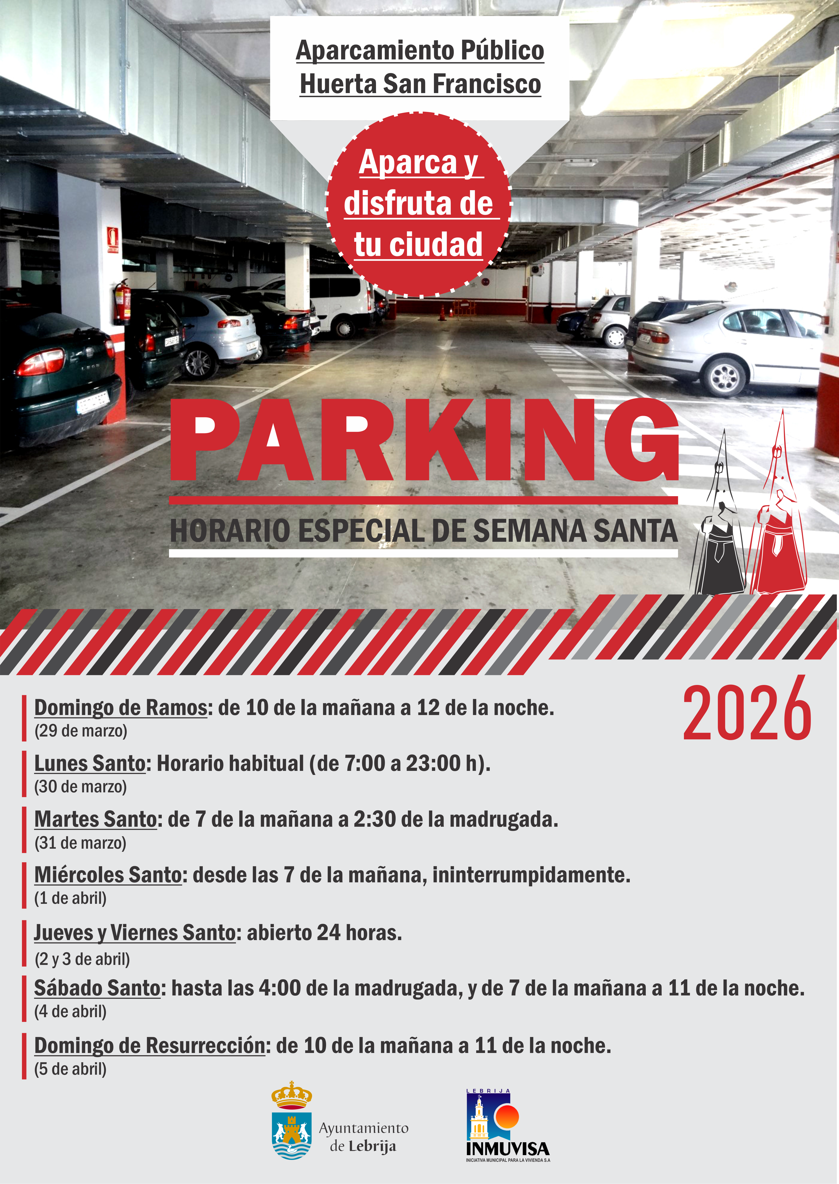 El Ayuntamiento de Lebrija informa que el aparcamiento subterráneo ubicado en la calle San Francisco tendrá un horario especial durante la Semana Santa, que se celebrará del 29 de marzo al 5 de abril de 2026.