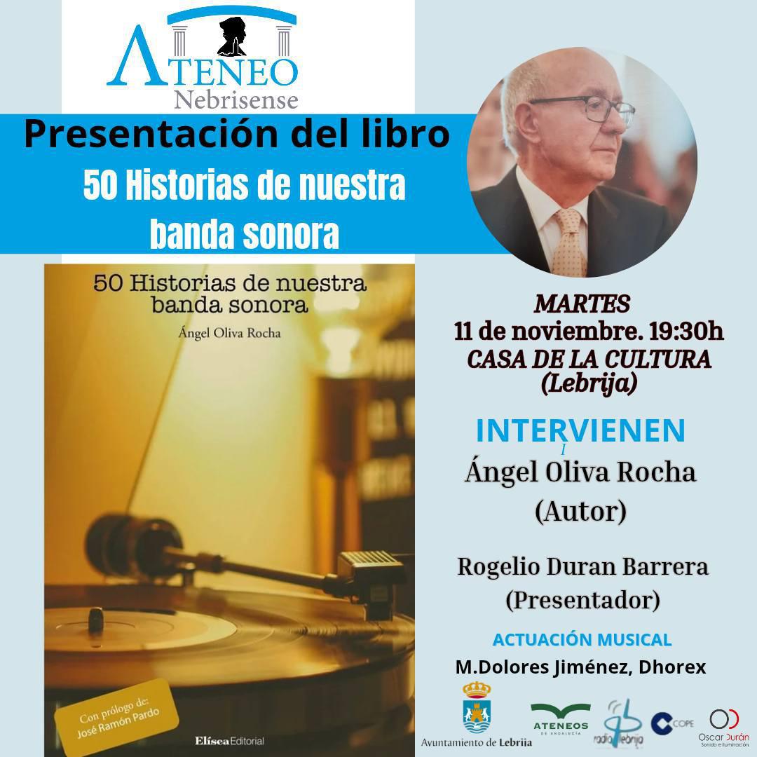 Este martes, 11 de noviembre, a las 19:30 horas, el Ateneo Nebrisense invita a todos los amantes de la música, la radio y la buena literatura a la presentación del libro “50 Historias de nuestra banda sonora”, escrito por Ángel Oliva Rocha, que tendrá lugar en el salón de actos de la Casa de la Cultura de nuestra ciudad.