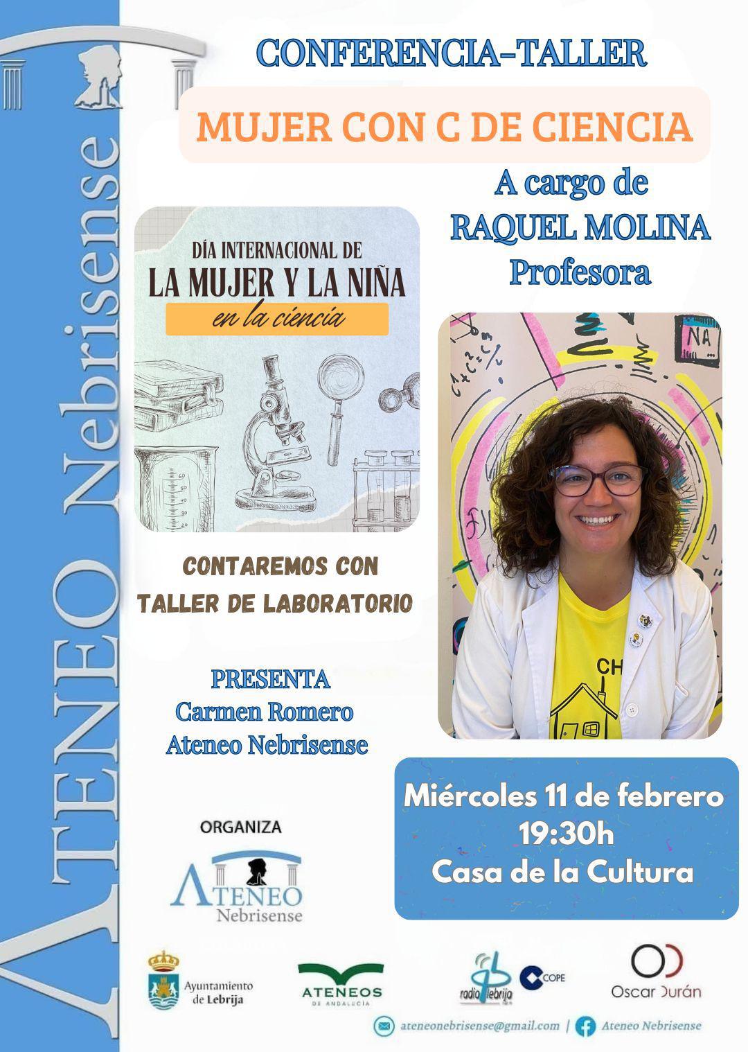 Este miércoles 11 de febrero, con motivo del Día Internacional de la Mujer y la Niña en la Ciencia, se celebrará la conferencia-taller “Mujer con C de Ciencia”, a cargo de la profesora Raquel Molina. La actividad incluirá un taller práctico de laboratorio, pensado para que todos los asistentes puedan experimentar la ciencia de manera participativa. La presentación estará a cargo de Carmen Romero M., en representación del Ateneo. El evento comenzará a las 19:30 horas en la Casa de la Cultura.