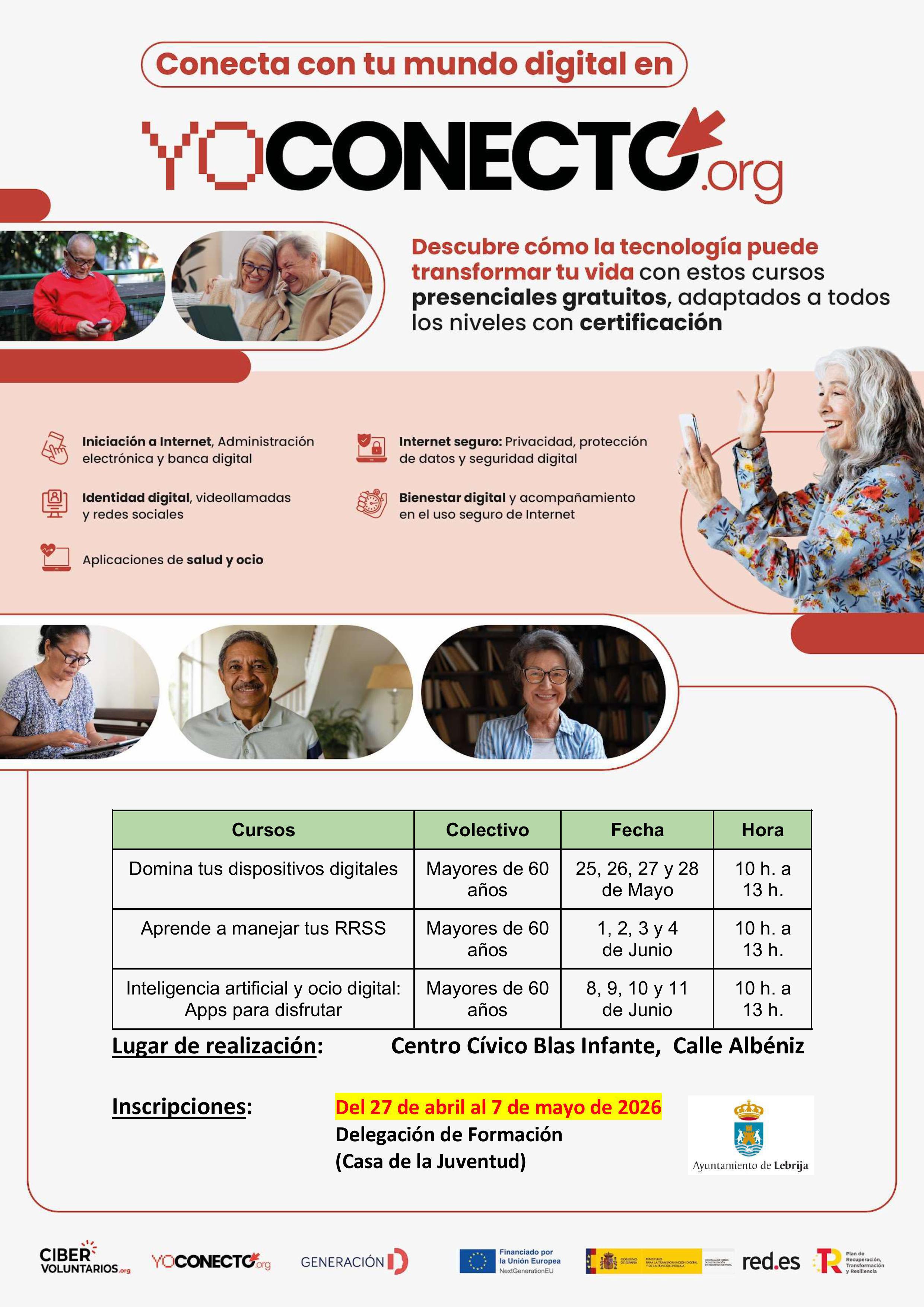 El Ayuntamiento de Lebrija, a través de la delegación de Formación, pone en marcha una nueva edición del programa formativo “Yo Conecto”, una iniciativa destinada a mejorar las competencias digitales de la población y fomentar el uso seguro, útil y creativo de las nuevas tecnologías.