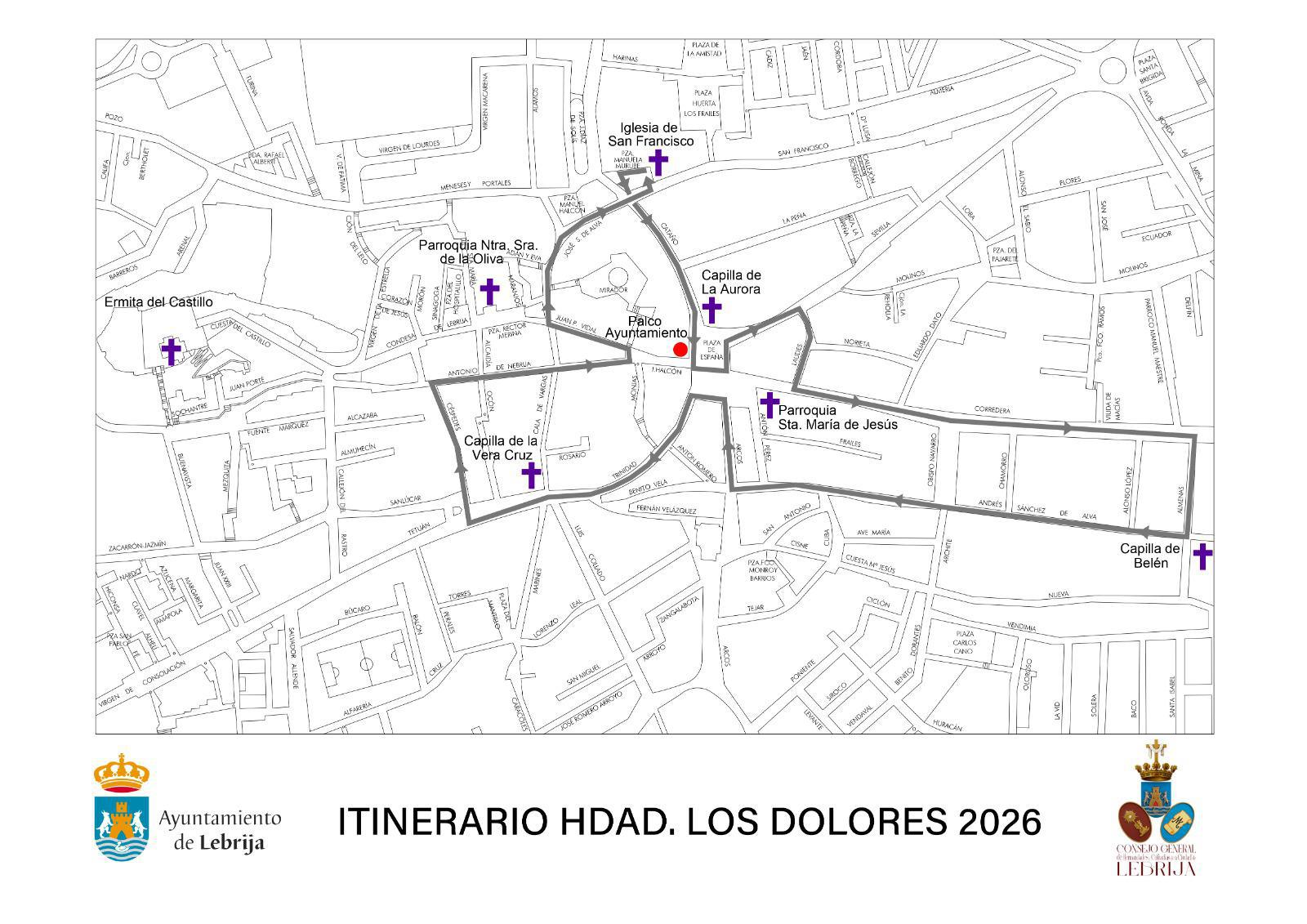 Recorrido: Salida desde San Francisco, Plaza Manuel Murube, Cataño, Palco, Plaza España (por el centro), Sevilla, Laúdes, Corredera, Almenas, Andrés Sánchez de Alva, Arcos, Plaza España, Trinidad, Tetuán, Céspedes, Antonio de Nebrija, Juan Pedro Vidal, José Sánchez de Alva, Plaza Manuela Murube, entrada en la Iglesia de San Francisco.
