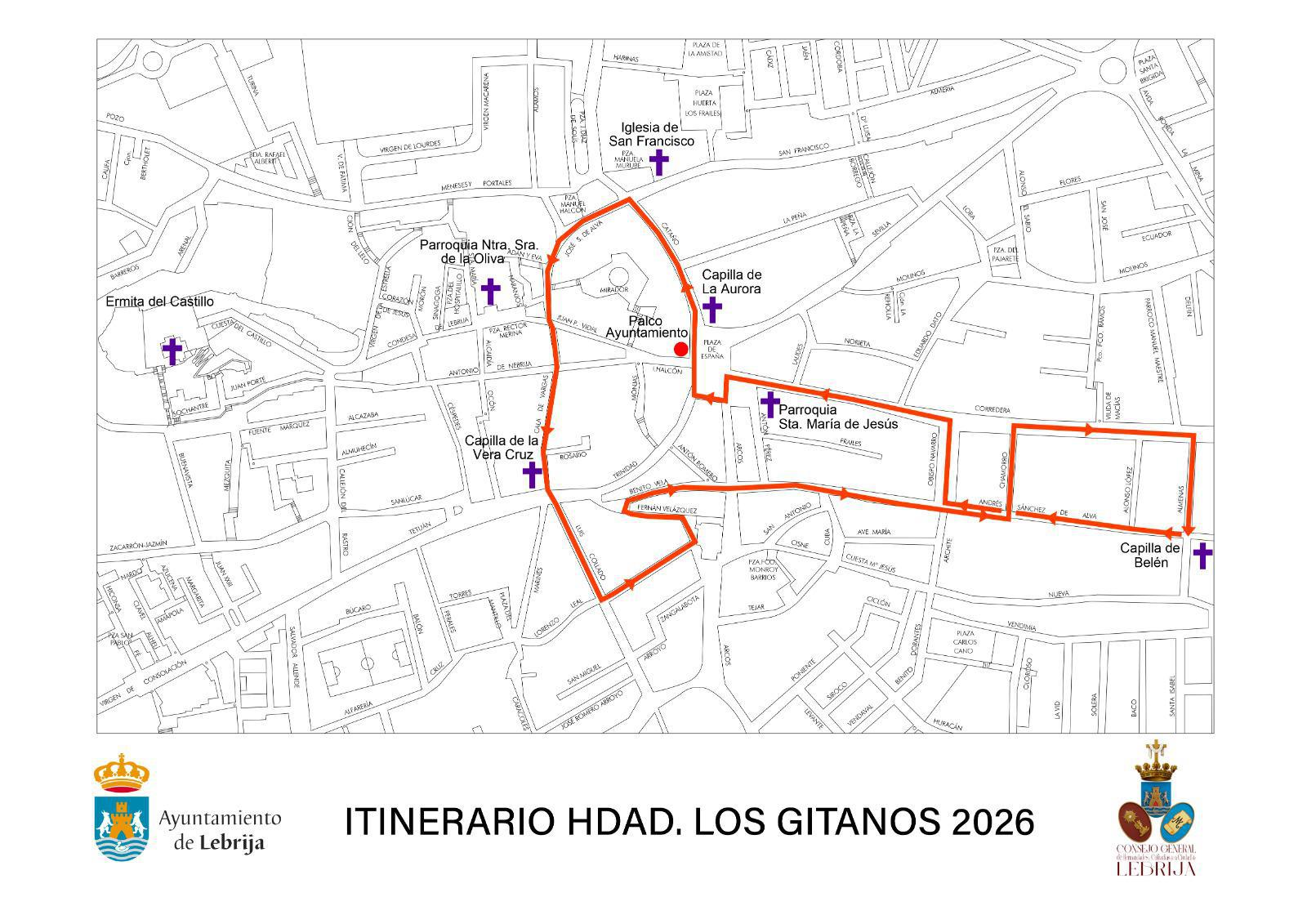 Recorrido: Salida de la Capilla de Belén, Andrés Sánchez de Alva, Obispo Navarro, Corredera, Plaza de España (girando a la izquierda por delante del monumento a Elio Antonio), Plaza España (Palco), Cataño, José Sánchez de Alva, Cala de Vargas, Luis Collado, Lorenzo Leal, Fernán Velázquez, Benito Vela, Andrés Sánchez de Alva, Chamorro, Corredera, Almenas y recogida en su templo.