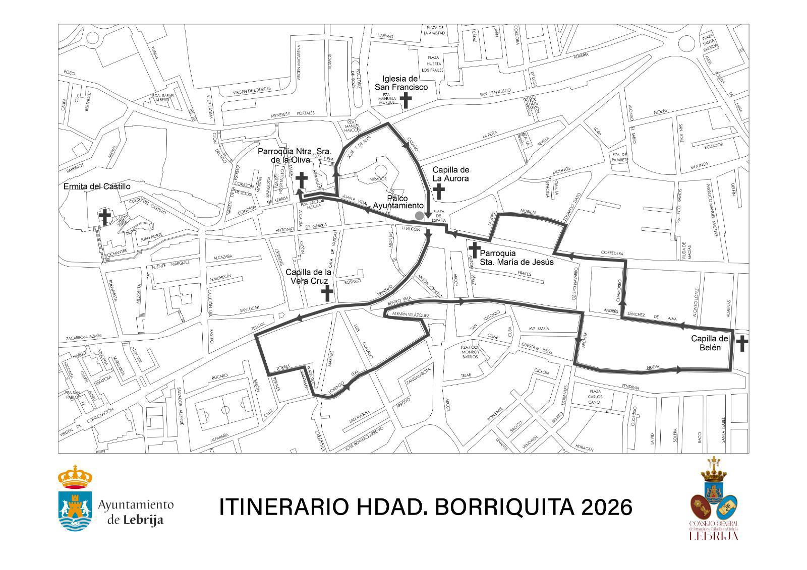 Recorrido : Plaza Rector Merina (salida del templo), José Sánchez de Alba, Cataño, Plaza de España (palco), Trinidad, Tetuán, Perales, Torre, Plazuela del Mantillo (Cruz del Mantillo), Lorenzo Leal, Fernán Velázquez, Benito Vela, Andrés Sánchez de Alva (Fontanilla), Archite, Nueva, Almenas (Iglesia de Belén), Andrés Sánchez de Alva (Fontanilla), Chamorro, Corredera, Eduardo Dato, Norieta, Laudes, Corredera, Plaza de España(por el centro de la Plaza), Ignacio Halcón, Juan Pedro Vidal (Hermanas de la Cruz), Plaza Rector Merina (Recogida en el templo).